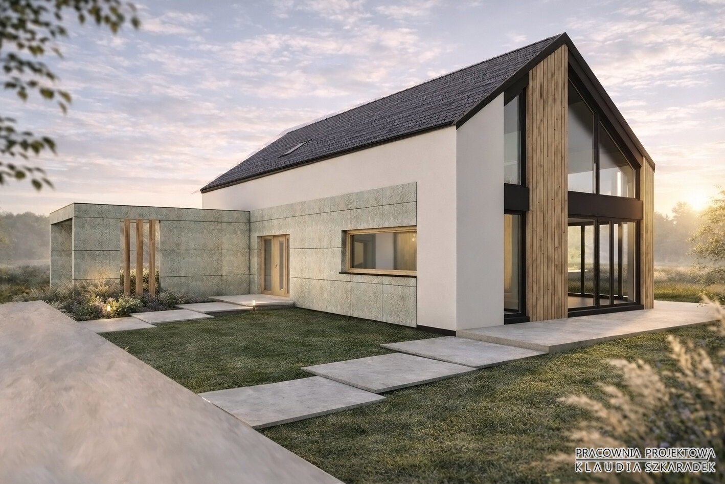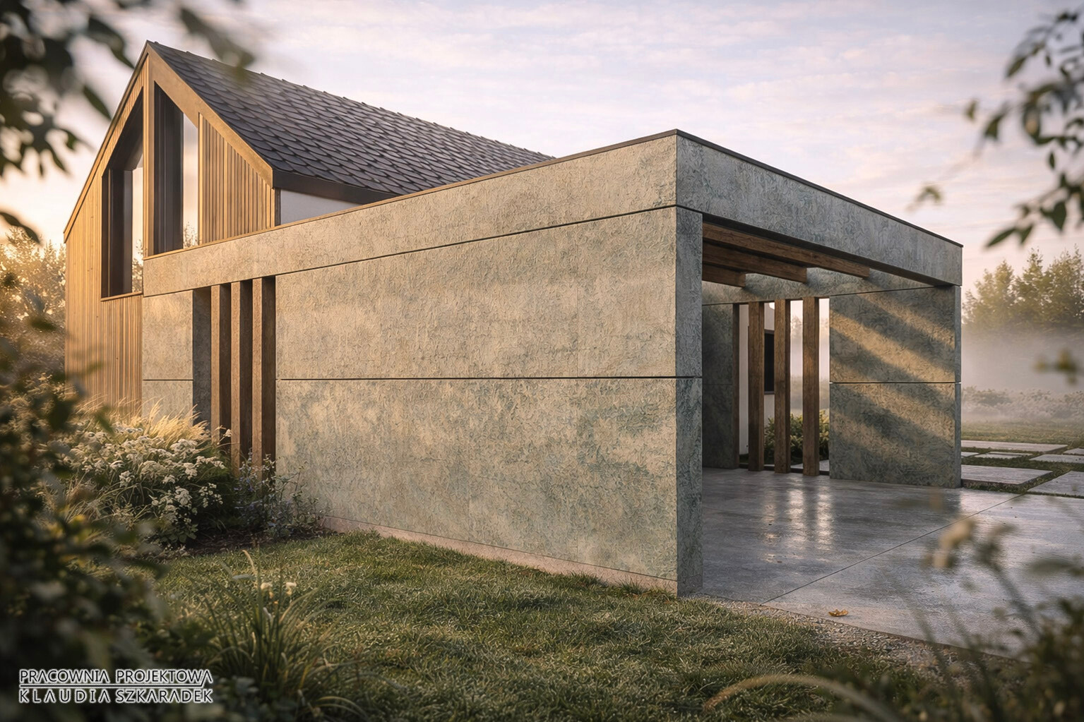 Projekt tego domu powstał jako jedna z koncepcji zaproponowanych inwestorom w procesie poszukiwania najlepszego kierunku architektonicznego dla tej działki. Od początku było jasne, że dom powinien być nowoczesny, ale zakorzeniony w krajobrazie i lokalnym charakterze miejsca. Ta propozycja była odpowiedzią na potrzebę połączenia prostoty formy z naturalistycznym wyrazem architektury.