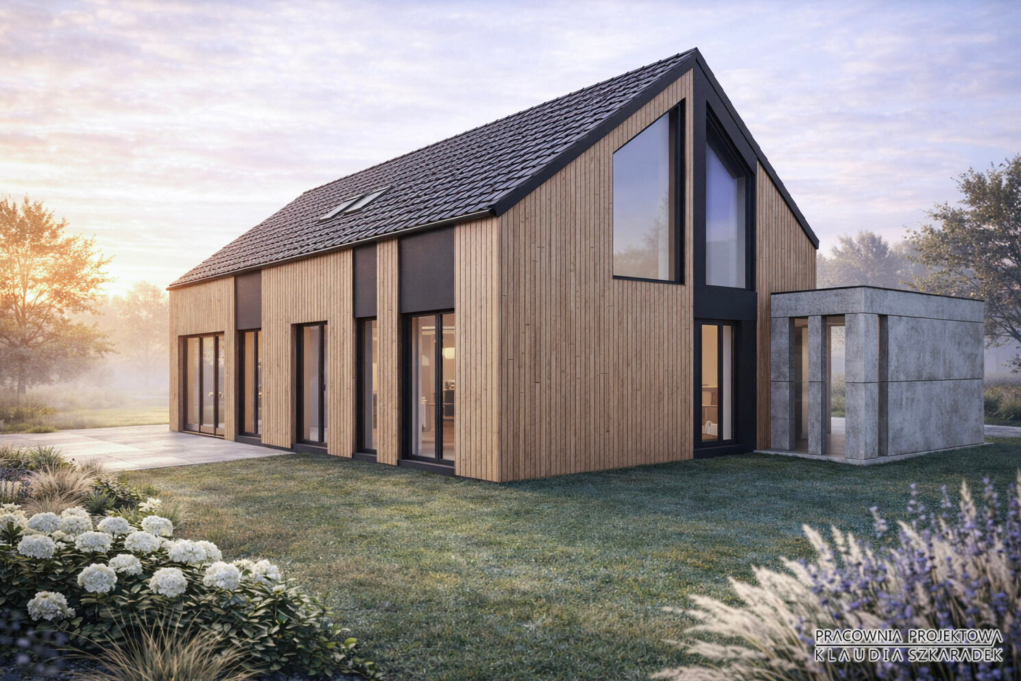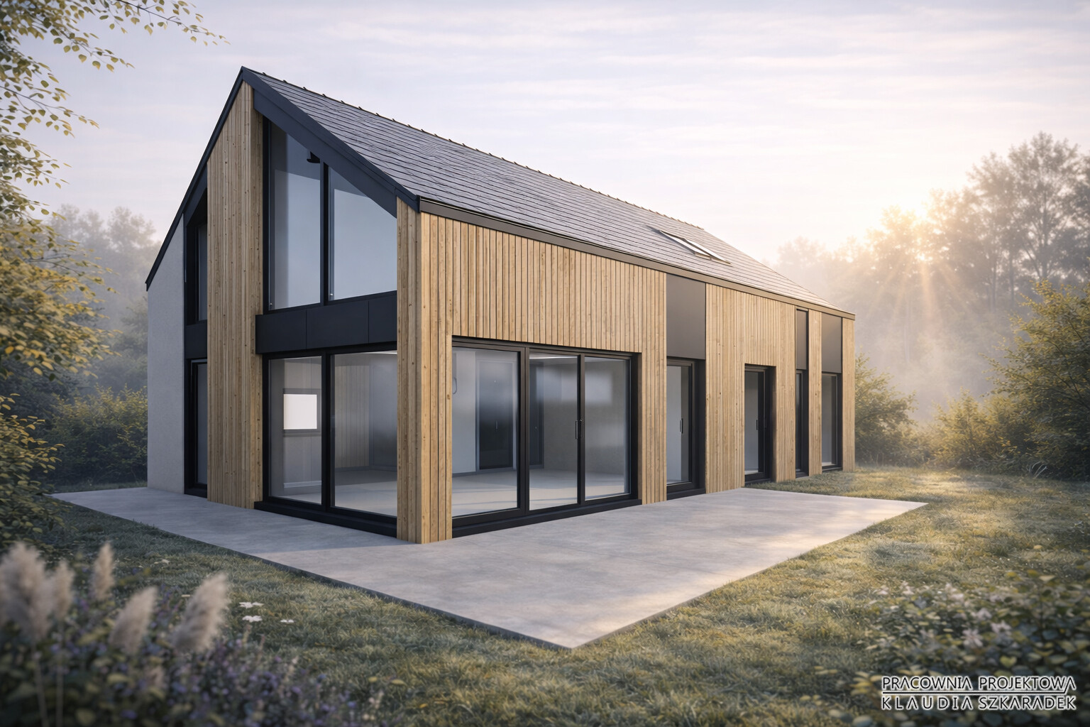 Architektura tej propozycji nie jest efektem jednego formalnego gestu, lecz konsekwentnej pracy nad proporcją, światłem, materiałem i relacją z krajobrazem. To jedna z wizji, która pokazuje, jak w sposób nowoczesny i odpowiedzialny można interpretować archetyp „stodoły” — tworząc dom funkcjonalny, trwały i harmonijnie wpisany w otoczenie.
