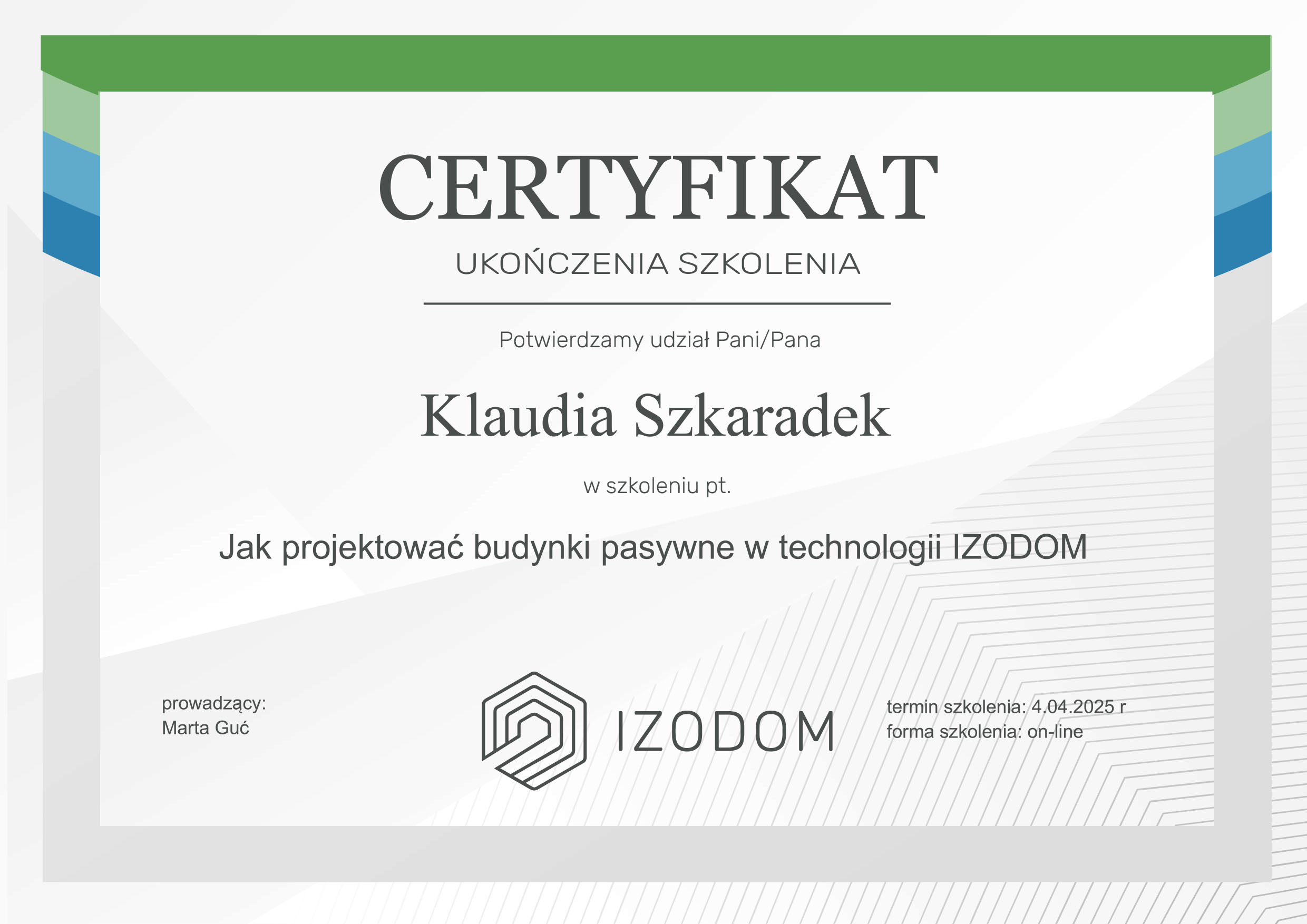 Specjalizuje się w projektach domów pasywnych, niskoenergetycznych i nowoczesnych budynków jednorodzinnych. Rozwijała swoje kompetencje m.in. w Akademii Budownictwa Zeroemisyjnego oraz programie Plan Zero prowadzonym przez ekspertów Pasywny M2 – jednej z najbardziej doświadczonych pracowni projektujących budynki pasywne w Polsce. Ukończyła również szkolenia z technologii szalunku traconego Izodom, co pozwala jej świadomie dobierać rozwiązania konstrukcyjne i energetyczne do indywidualnych potrzeb inwestora. Dodatkowo kurs „12 strategii inwestowania w grunty” (Hectares) poszerzył jej kompetencje o analizę potencjału działek i świadome podejmowanie decyzji na etapie wyboru nieruchomości.