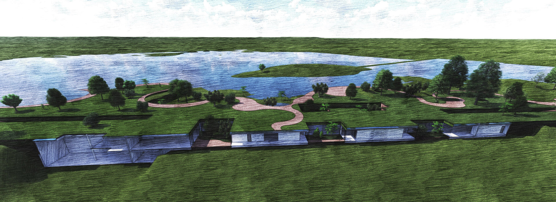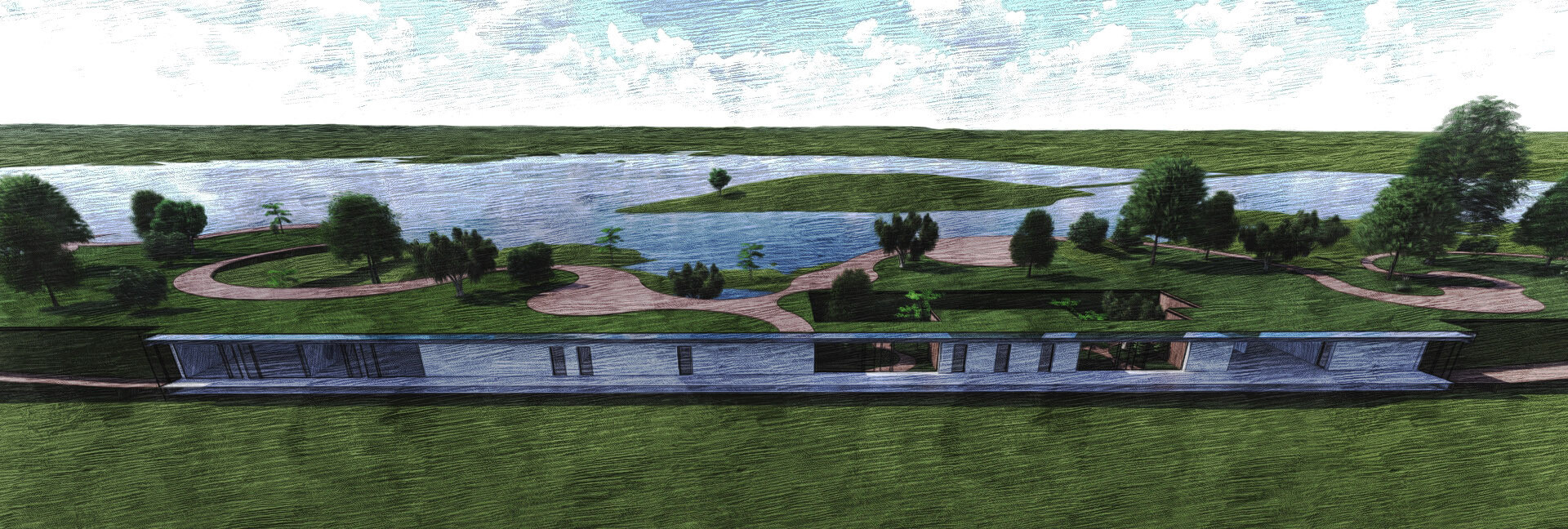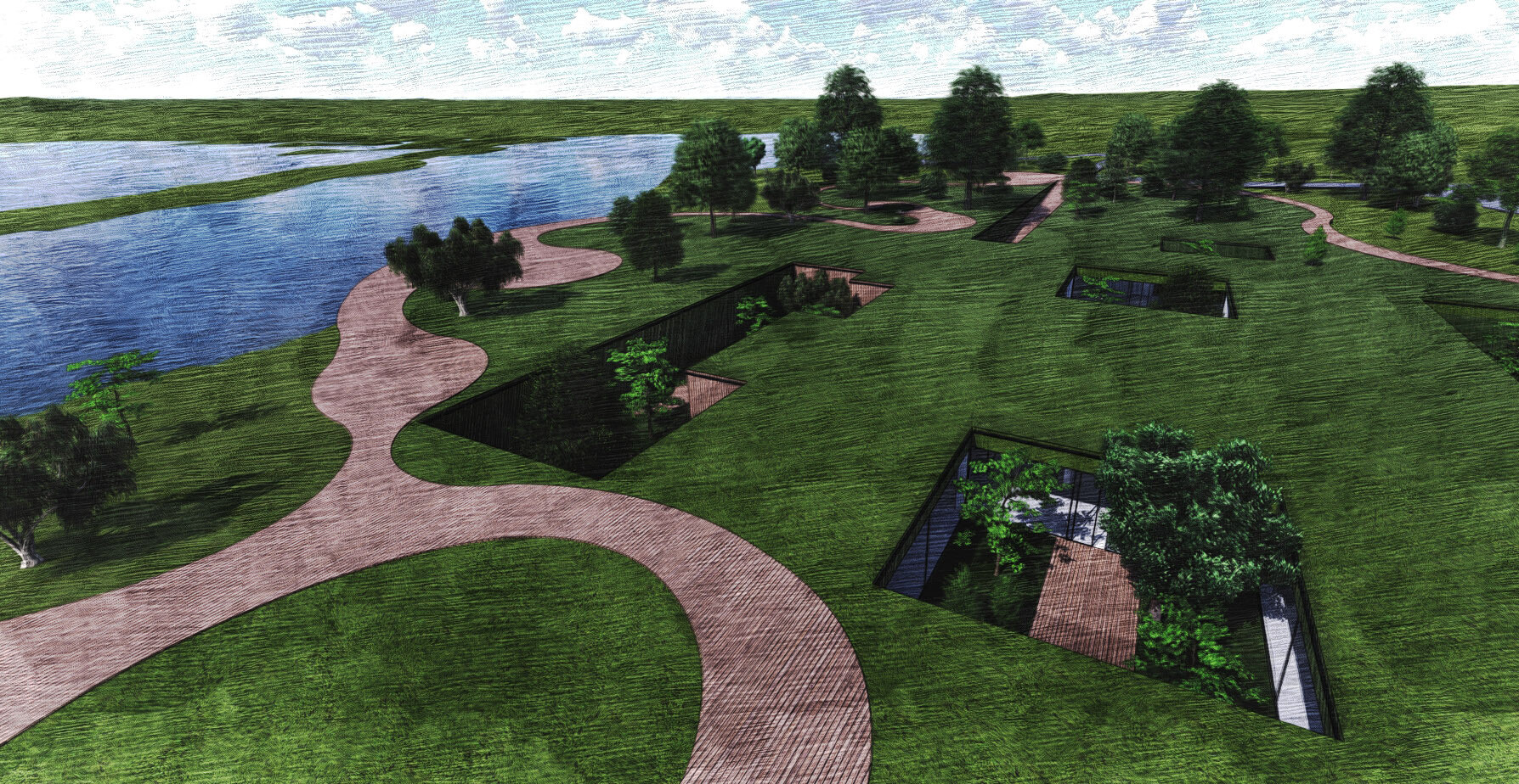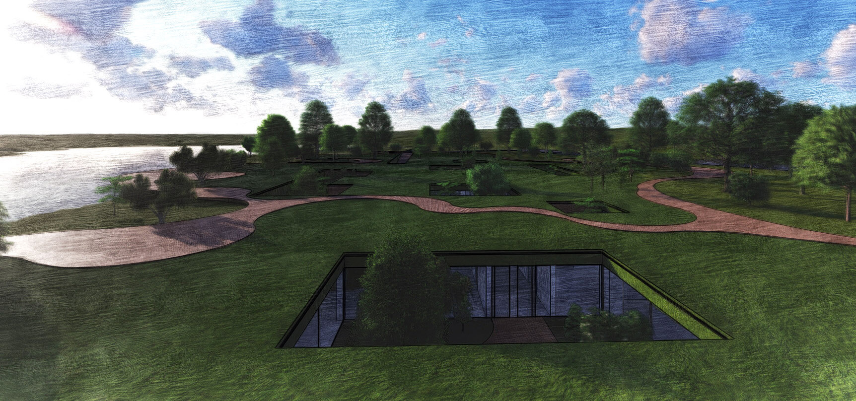 Nowoczesny budynek rekreacyjny, zaprojektowany z myślą o harmonii z otoczeniem i zrównoważonym rozwoju. Jego konstrukcja częściowo ukryta pod ziemią minimalizuje ingerencję w krajobraz, jednocześnie zapewniając naturalne doświetlenie wnętrz poprzez przeszklone dziedzińce. Obiekt wykonano z żelbetu monolitycznego, a wnętrza wykończono mikrocementem, co nadaje mu minimalistyczny charakter. Wnętrze podzielono na strefy funkcjonalne, w tym przestrzenie czytelnicze, sale konferencyjne i strefy relaksu. Dzięki zastosowaniu pasywnych systemów ogrzewania i chłodzenia oraz paneli fotowoltaicznych budynek charakteryzuje się wysoką efektywnością energetyczną. Zielone dachy dodatkowo poprawiają izolację termiczną i retencję wody deszczowej. Nad budynkiem zaprojektowano park rekreacyjny, który pełni funkcję otwartej przestrzeni dla mieszkańców. Znajdują się tam ścieżki spacerowe, tereny zielone oraz strefy odpoczynku, integrujące architekturę z naturalnym krajobrazem.